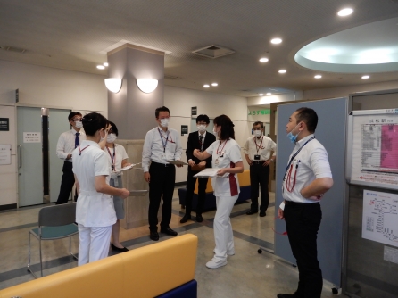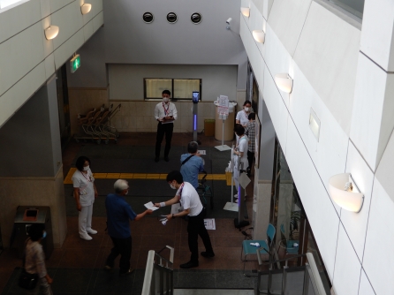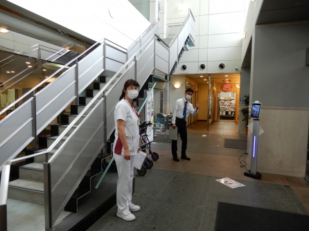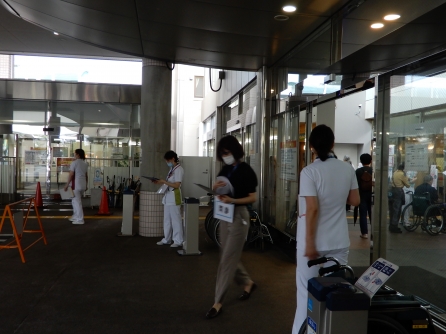 新型コロナ感染症の広がりを受け、これまで外来・検査は各サテライト・受付で、病棟はスタッフステーション入口で健康チェックを行っていましたが、7月29日から正面玄関口で行うようにしました。病院を利用される全ての皆さまには多大なご協力をお願いすることになりますが、感染対策としてよろしくお願いいたします。