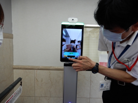 顔を近づけると測定出来る体温計を2台設置しました。28日、使用方法を教えてもらいました。