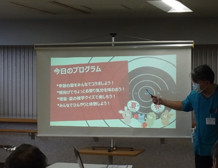 C6病棟で臨床心理士を中心に行っている「あたまほぐしの会」の企画で「納涼祭」を行いました。 会の前後には手洗いうがいをして、距離をとって座って感染予防をしています。 ギター演奏は男性看護師2名で「浜辺の歌」を演奏し、歌とトーンチャイムを合わせました。 灯籠は先週のあたまほぐしの会で患者さんが作成、輪投げは3チームに分かれて、棒の裏に書かれた点数で競いました。「雑学クイズ」は毎回行っており勉強になります(笑)。最後にアイスを食べて終了となりました。 情報提供 C6課長石切さん ありがとうございました。