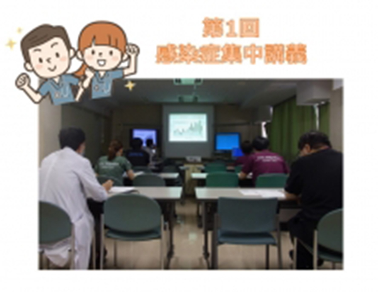 こんにちは! 今日は毎年恒例の感染症集中講義のお話しです♪ コロナウイルス流行のため、今年の開催は未定となっていましたが、感染対策を実施の上開催することが出来ました!! 感染症集中講義第1回目の様子をご案内します! 感染症集中講義は、臨床研修センター長のS先生(感染症・リウマチ内科部長)と薬剤部・臨床検査部の皆様にご協力いただき、講義とグラム染色の実技を行います。 午前中、感染症・抗菌薬についての講義からスタート☆ 臨床研修センター長のS先生からの講義では、講義を聴きながらワークシートの空欄を埋めていました。 最後に講義で習ったことをもとに模擬症例を解いて
