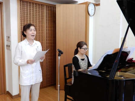 ホスピスでのコンサート。チャプレンと看護師Nさんです。ピアノと歌声、病棟全体に伝わりますように。