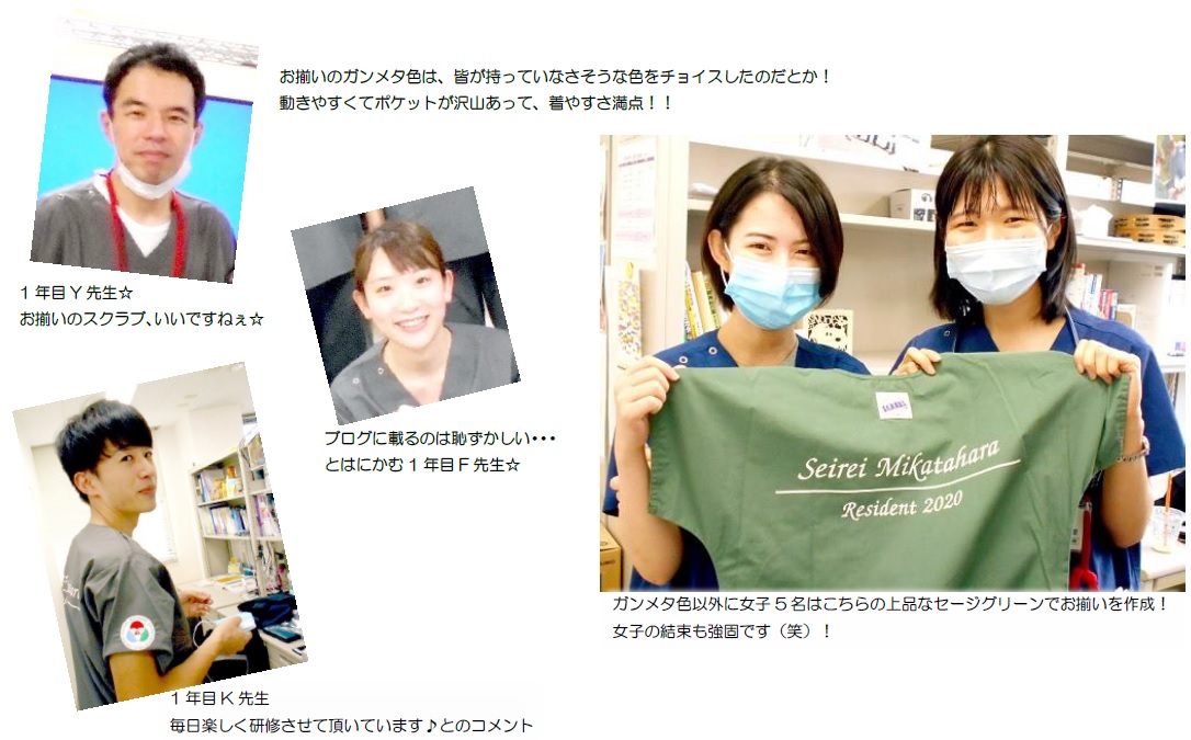 研修センターにいる研修医のうち誰かが日替わりで「Seirei Mikatahara Resident 2020」のロゴの入ったスクラブを着ています。