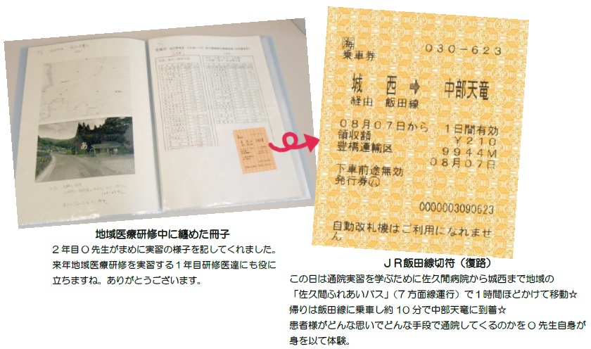 O先生は佐久間病院の一般外来のほか訪問診療、往診、通所介護、無医地区への巡回などを病院の先生方について実習させて頂きました。