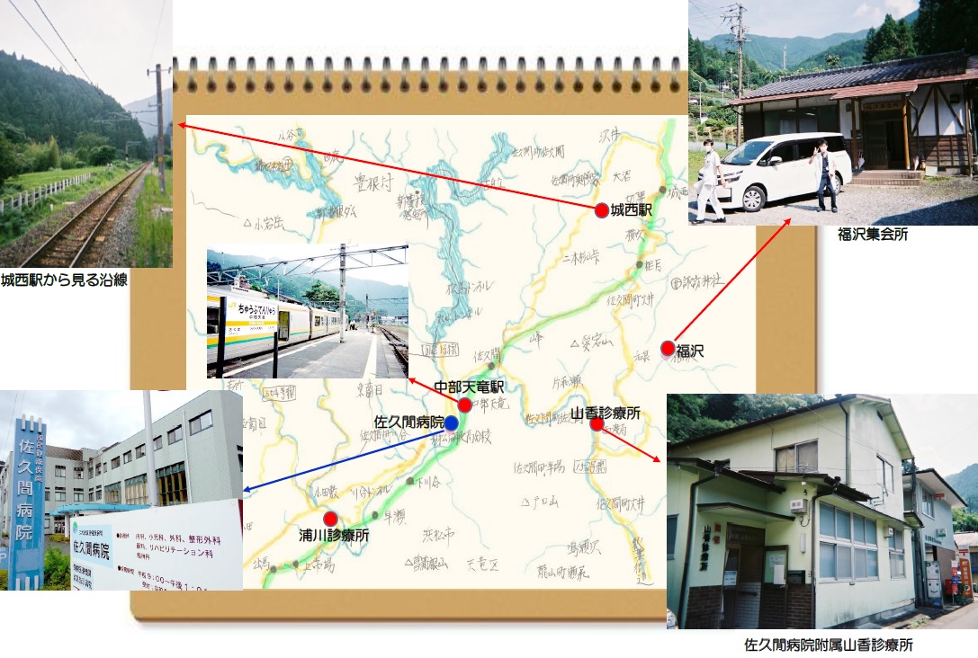 佐久間病院では病院での診療以外に各地域に点在する診療所の巡回診療や通所介護訪問などがあります。