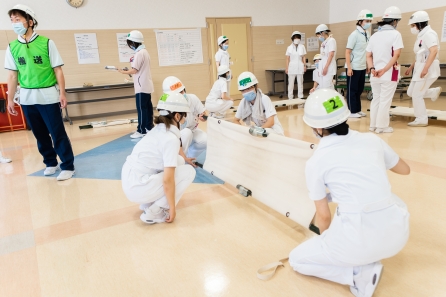 訓練では最初は講義を、その後に地震初動活動や消火栓の取り扱い、搬送方法を学び、最後に院内の防災設備を見学しました。