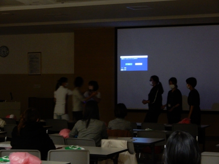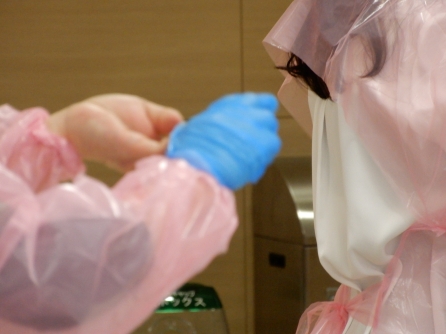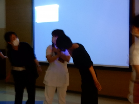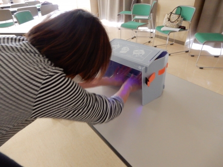 部屋を暗くして手を介した接触感染を感じてもらいます。。。