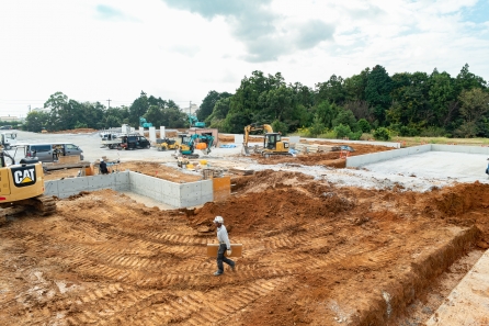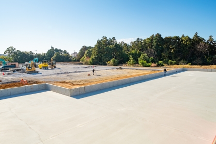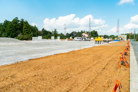 工事は造成工事の真っ只中。土地の北側には大きな調整池を整備し、西側には擁壁を整備しています。