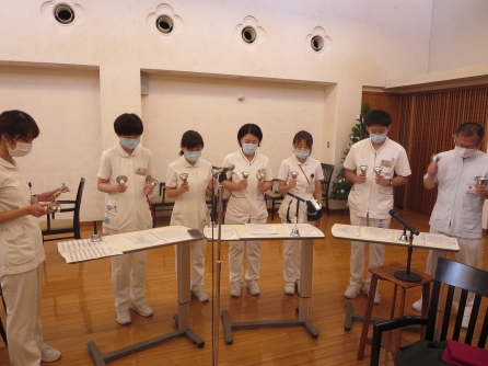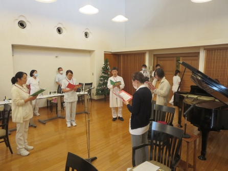 そのような状況であっても楽しみにしている患者さんやそのご家族のためにと、今年は職員のみが礼拝堂に集まり患者さんは各自の部屋でスピーカー越しに美しい歌声やハンド・ベルの音色を聞いてもらうようにしました。