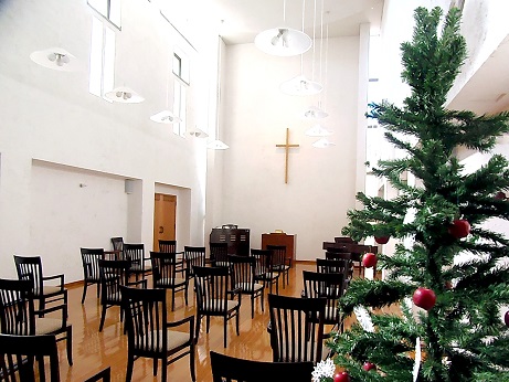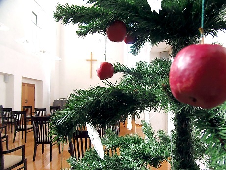 礼拝堂内クリスマスツリーには“姫リンゴ”が飾られています☆