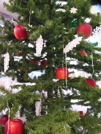 病院内に飾られたChristmas Treeはプロテスタント式で、赤いりんご(紅玉という品種の本物のりんごです!)は、“豊かな実り”の象徴、クリスマスツリーの頂上の星は“希望”、ラメッタ(キラキラしたひも状の飾り・雪やツララを表現)は“贈り物”を表していると言われています。