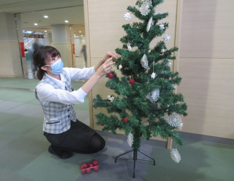 はやいもので12月になりました。 院内ではクリスマスツリーの設置、飾り付けをボランティア委員会の職員メンバーで行いました。 毎年、ボランティアのみなさんにご協力いただいていますが、昨今の事情により今年は職員での設置となりました。 当院では、ツリーにリンゴを飾っています。 なぜリンゴを飾り付けるか皆さん知っていますか? リンゴは、アダムとイブが食べた「知恵の木の実」を象徴しているといわれ、「幸福」や「豊かな実り」の願いが込められてツリーに飾られるようになったそうです。リンゴに糸を付ける作業はなかなか細かくて難しかったです。 ボランティアの皆さんいつも細かい作業していただきあり