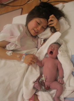 降りてきた頭の感じが思っていたより大きいと感じましたが、出生後に実際に測ってみたら出産前の推定よりだいぶ大きかったのにはママも驚いていましたね。生まれてすぐに元気な声でしっかり泣いてくれました。