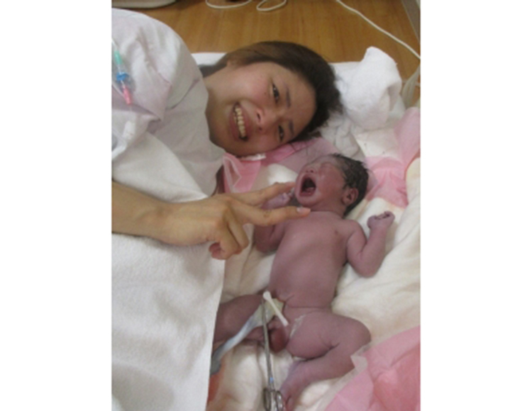 椅子に座り、陣痛を冷静にじっと耐えている姿がとても印象的でした!弱音を吐かずに頑張っていましたね。お産が近くなって来たときに、ご家族に電話で応援してもらっていました。とても心強かったと思います。 初めてのお産でしたが、いきむのが上手でスムーズに赤ちゃんの頭が出てきました。落ち着いていたお産でしたね♪ ご出産本当におめでとうございます。 育児楽しんでくださいね。