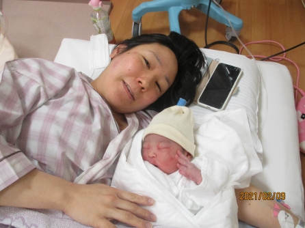 予定日丁度に産まれてきてくれた男の子は、予想を遙かに超えた大きな、大きな赤ちゃんでした。頭が出るときの痛さが辛かったそうですが、上手な呼吸方でゆっくり、ゆっくり落ち着いて息んでくれましたね。臍の緒が首に巻いた状態でしたが、赤ちゃんへの負担も少なくて済みました。ありがとうございます。
