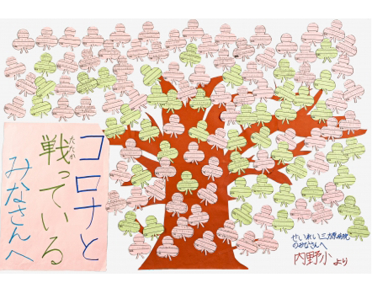 浜松市立内野小学校児童のみなさんから、 コロナと戦う方々に向けた応援のメッセージをいただきました。 「大変だと思いますが、これからもがんばってください!」 「おうえんしています。」 「コロナに負けるな」と手書きのメッセージが大きな木のモチーフに可愛く飾られていました。 足を止めてメッセージに見入る人も多く、職員のひとりは「とても元気づけられた。」と話していました。