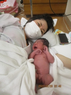 自宅に一旦帰ってから、急にお産が進んで。。。病院に到着してから、あっという間に元気な男の子が誕生しました!
