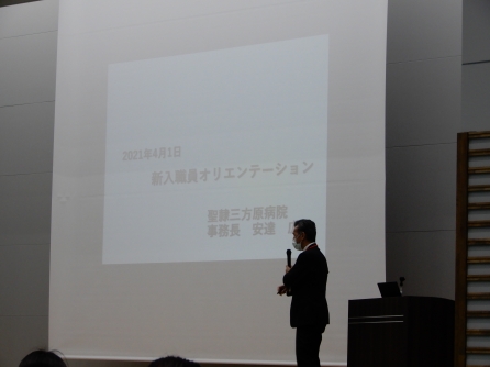 院長に続き私、そして事務長の話となり、私は医師オリのために病院大ホールへ移動しました。新入職者にとってはスーツで次から次の情報、緊張と疲労の1日だったのではないでしょうか。来週はいよいよ看護部導入研修が始まります!!