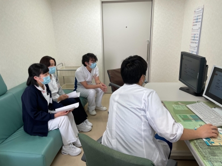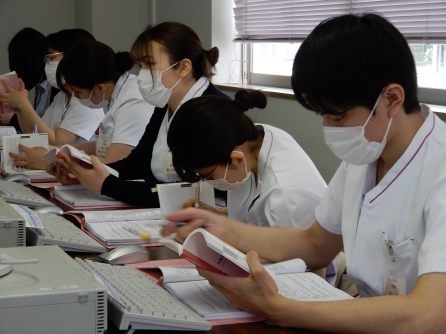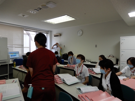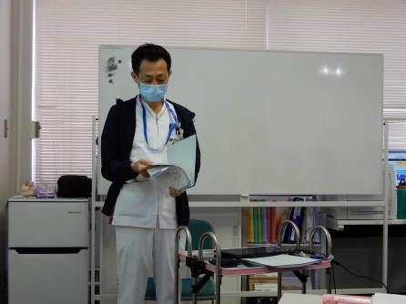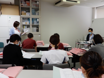 C5病棟、精神保健指定医による精神保健福祉法の勉強会です。係長と新人看護師2名が受けています。情報提供M課長