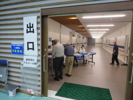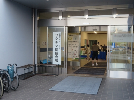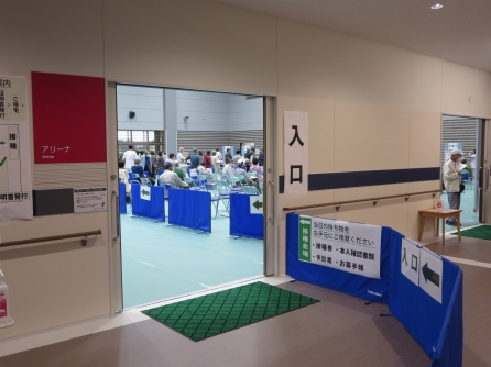 ワクチン接種会場の入口です。手指消毒をしてからお入りください。