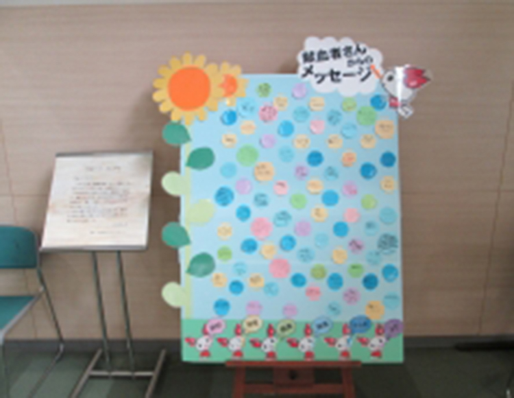 例年、浜松学生献血推進委員会主催の「学生サマー献血キャンペーン」にて、献血にご協力いただいた方々から患者さんへ応援メッセージをお預かりし、それを可愛くパネルにまとめ院内に掲示しています。 今年はけんけつちゃんのイラストがちりばめられ、向日葵をあしらったデザインで爽やかな夏を連想させるものとなっています。 7月23日(金)までF号館1階のステンドグラスしたに展示しています。 是非ご覧ください!