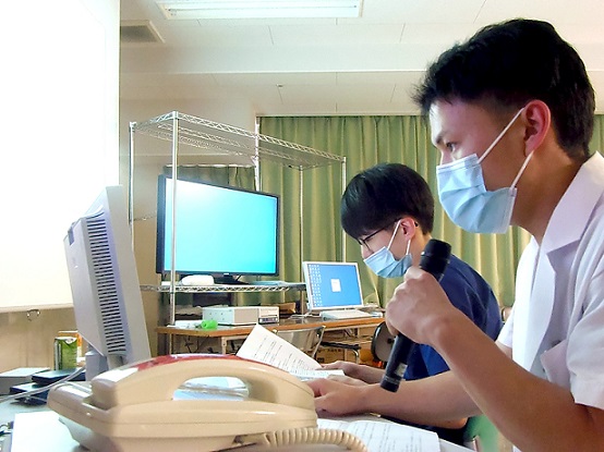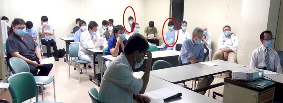 1年目研修医の時に先輩のCPC発表を熱心に聴講している2年目K先生(中央)&K先生(右:扉付近)