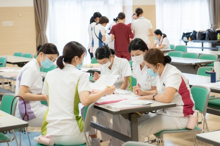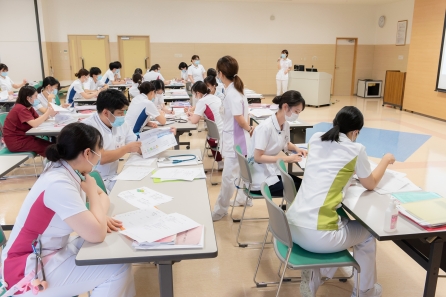 9月14日と22日の2班に分かれ、7月の基礎編1につづき、基礎編2が行われました。対象はクリニカルラダーⅠをめざす看護職なので、今年入職の新人看護師達の研修になります。模擬事例を使用して実際にフィジカル圧すメントを行います。今回の写真は22日の研修だけになりますが、そろそろ半年が経過し、やれることが増えた分だけ業務内容により専門的な知識とスキルが求められ苦労しているのではないでしょうか。夜勤の数も増えてきて体力的にもつらい時もあるでしょう。めざす看護師像を思い出して頑張りましょう!