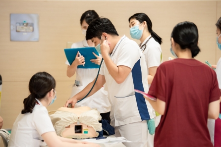 模擬事例をもとにモデルを使用してフィジカルアセスメントをしていきます。手前2人はファシリテーターです。1人は研修生を支援し1人は呼吸音などをモデルに代わり出してくれています。