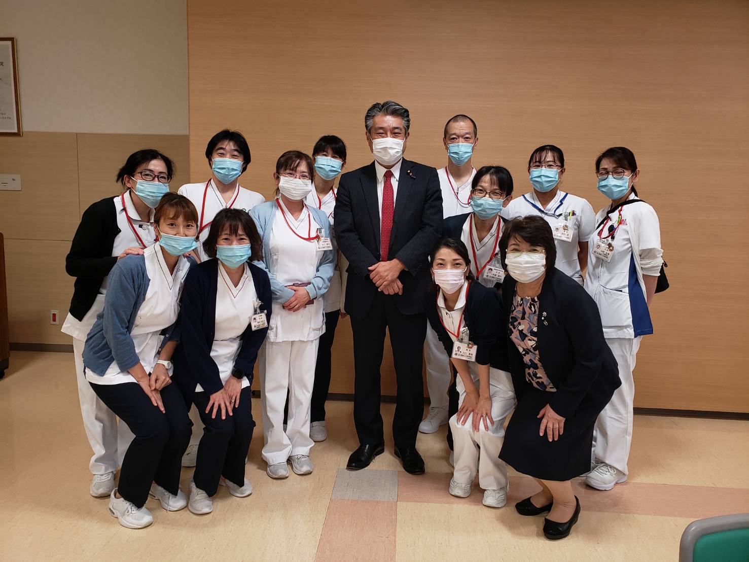 10月18日昼の30分間ですが、静岡県看護連盟の柏崎新会長と原田さん、そして石田議員が現場の声を聞く目的で来訪しました。短い時間ですが40名ほどが集まり色々な意見をしたり、質問をしたりする時間をもちました。コロナ対応のことや、医師の働き方改革、看護の基礎教育のこと、また先週の課長会で2022年度の診療報酬改定に向けての話をしたところだったので、ちょうど良いタイミングで頭を使えました。1つ1つの意見や質問に対し石田議員の意見も聞けて有意義な時間となりました。