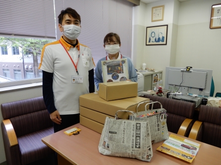 10月22日AM,大瀬モータースのお若い夫婦がみえました。目的は大瀬モータース企画「思いやり講座」で集まったお気持ちを「アマビエ焼印入りどらやき」にして届けてくれるためです。他にも手作り新聞紙バックにお菓子を入れてきてくれました。その温かい気持ちに感謝感謝です。今回はコロナ受け入れ病棟、疑似症受け入れ病棟、救急外来、ワクチン担当者、そして呼吸器内科の医師達にお渡しすることにしました。今も地域の皆さま1人ひとりの感染対策のおかげもあり、コロナは落ち着きをみせています。このまま、コロナのない年末年始が迎えられると良いのですが。。。
