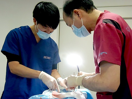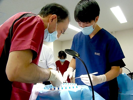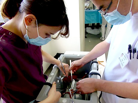動物の心臓を用い実際の手術器具を使って、人工血管置換術や大動脈弁置換術、CABG(冠動脈バイパス術)などの手術手技を色々と体験できます。