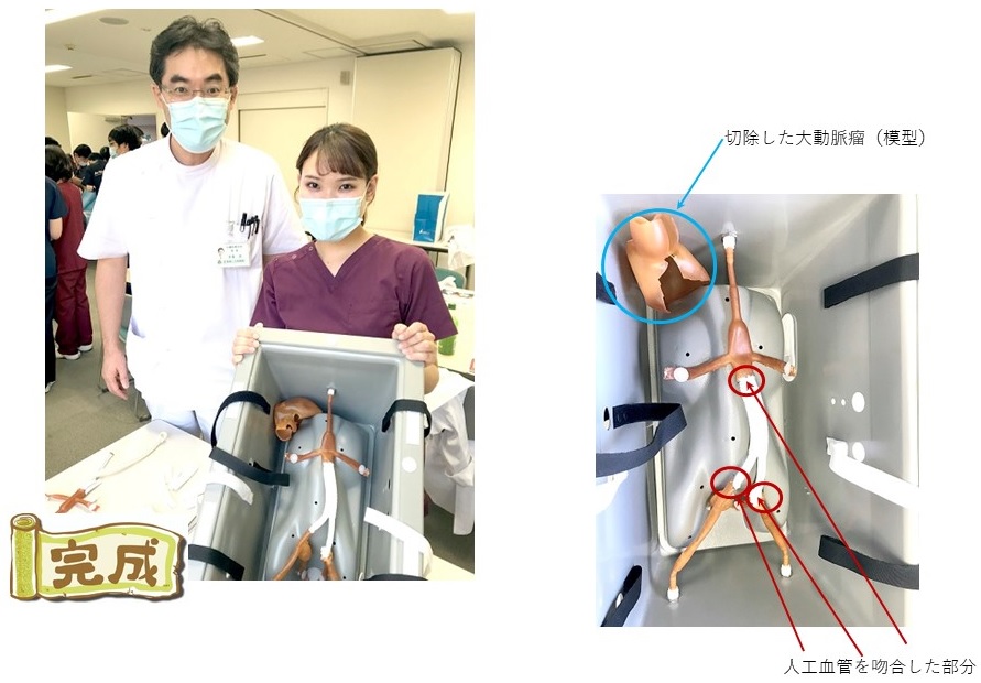 腹部の大動脈瘤を切除して人工血管を模型の血管に繋げる練習