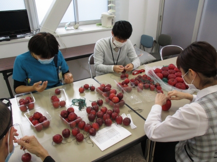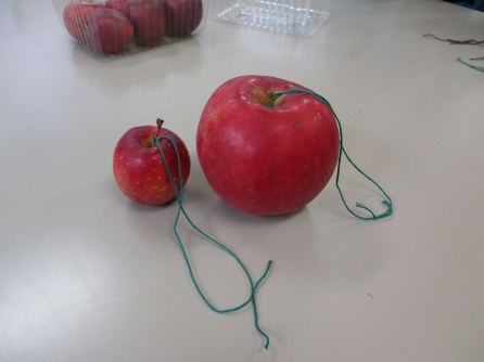 最初に、りんごに糸を付ける作業
