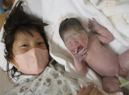 破水で来院されましたが、急に陣痛が強くなり急いでたんぽぽに移動。あれよあれよという間にお産が進み、とっても元気な女の子が誕生しました!