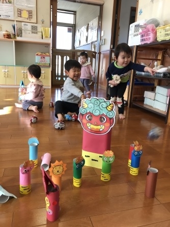 鬼の的に向かって、新聞紙で作った大きな豆を投げて鬼退治ごっこを楽しみました。