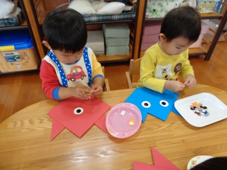 目、鼻のシールを貼って完成です。怖い鬼というより可愛らしい鬼ですね☆
