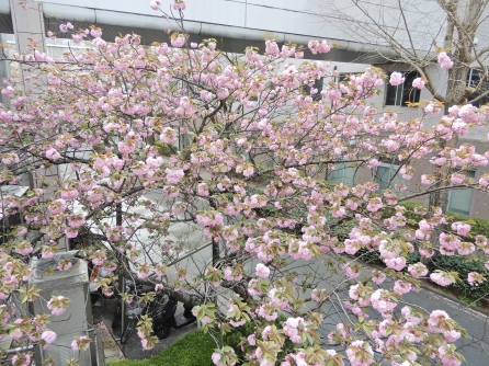 管理室から見える八重桜が見頃です