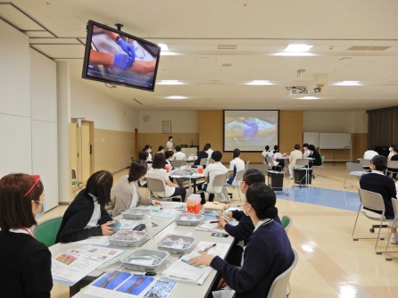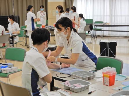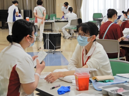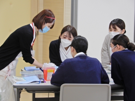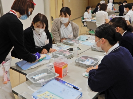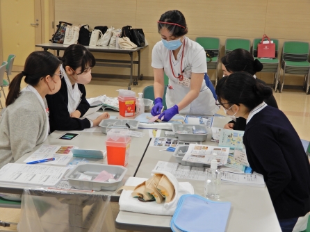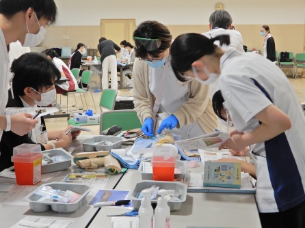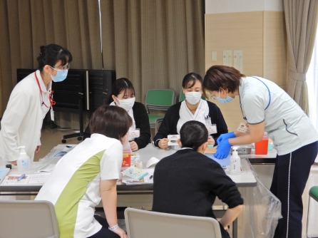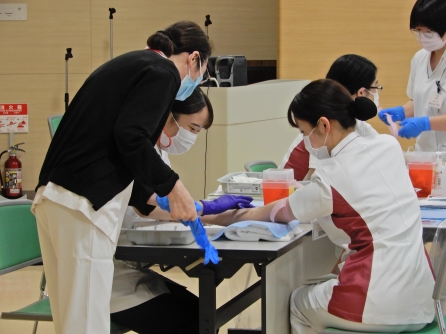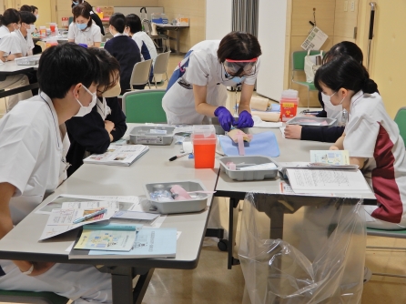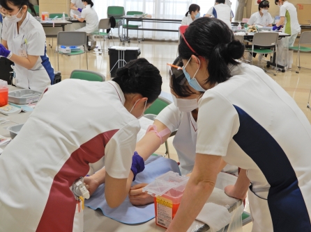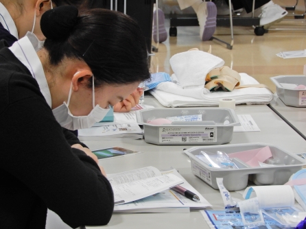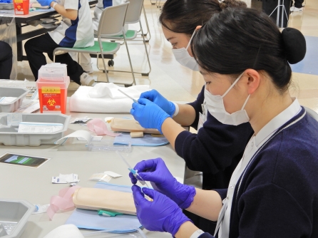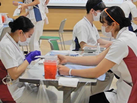 モデルでの演習も終え、いよいよお互いに腕を出し合って実践です。