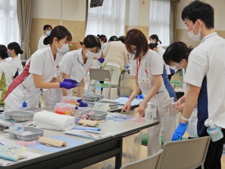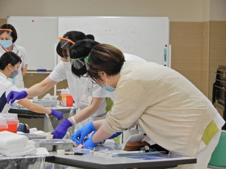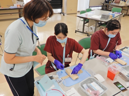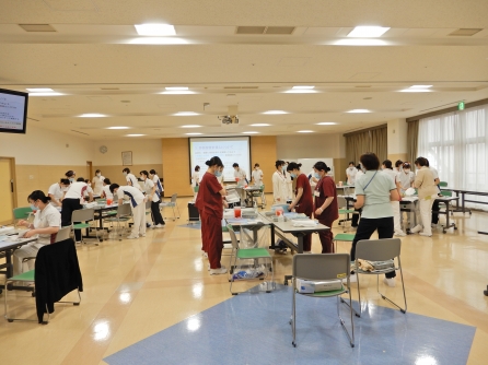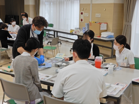 教育委員会のメンバーを中心に4人の研修生に1人の指導者がついて演習を進めます。