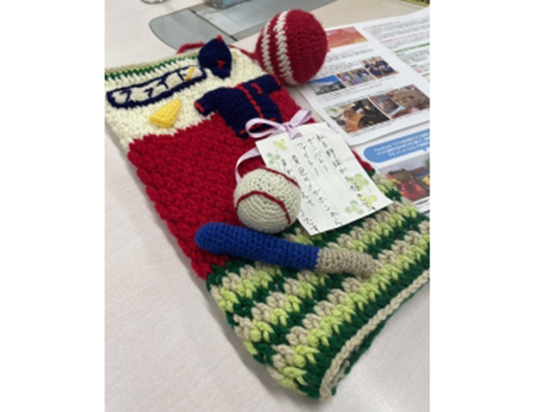 この「マフ」はある会でボランティアで作って下さった物でM課長から紹介されました。「マフ」とは元来毛皮や織物で作られた両端の開いた円柱形の防寒具なのですが、近年、認知症の方の落ち着かない手を優しく温かく保ち、触覚、視覚という感覚を用いたケアに使われています。野球にたずさわってきた方のためにこのようなデザインで作ってくれたそうです。赤いボンボンは筒の中で触ったりできるのでしょう。デザインもとっても素敵です。患者さんにどのようにこのぬくもり、優しさ、楽しさが伝わるのか、感じられるのか、考えただけで幸せな気持ちになります。