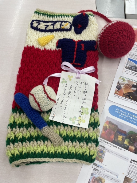 この「マフ」はある会でボランティアで作って下さった物でM課長から紹介されました。「マフ」とは元来毛皮や織物で作られた両端の開いた円柱形の防寒具なのですが、近年、認知症の方の落ち着かない手を優しく温かく保ち、触覚、視覚という感覚を用いたケアに使われています。野球にたずさわってきた方のためにこのようなデザインで作ってくれたそうです。赤いボンボンは筒の中で触ったりできるのでしょう。デザインもとっても素敵です。患者さんにどのようにこのぬくもり、優しさ、楽しさが伝わるのか、感じられるのか、考えただけで幸せな気持ちになります。