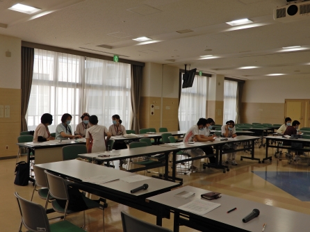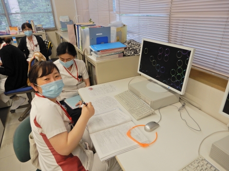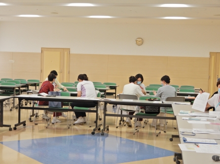夕方の管理室の風景。病棟業務が一段落してから職場長が管理室に相談に来ることが多いです。この日はM課長が〆切迫ったレポートの指導を受けていました(ガンバレー)。
