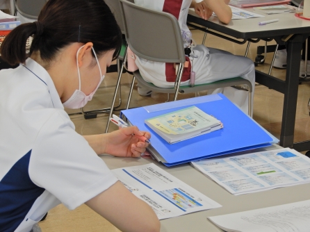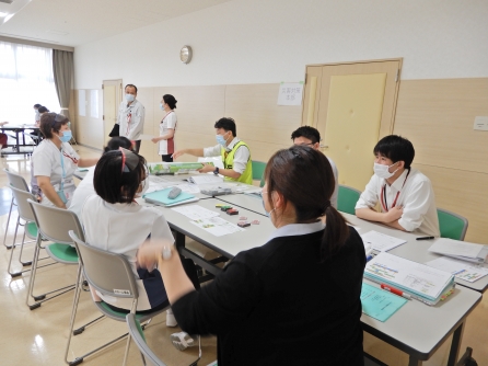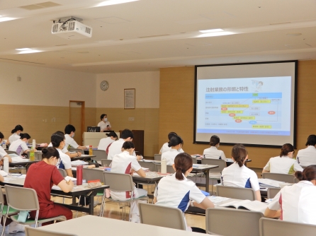 静脈注射2の研修No2 先日アップしたのは演習の風景でしたが、こちらはその前の講義の様子です。今年から安全業務担当の伊藤次長の講義です。
