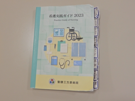 新人看護師の実践ガイドをお借りしました。まだ1ヶ月半、使い込んでいるのがよく分かりました。