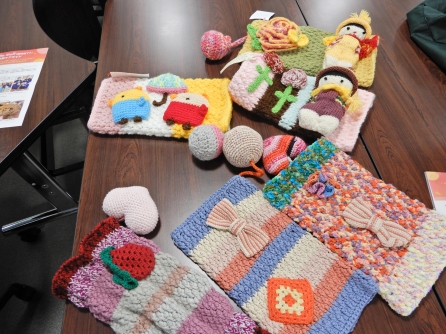 院内の別の所では県看護協会の研修「認知症高齢者対応力向上研修」のための研修動画を撮影していました。多職種カンファレンスや実際の患者ケアの様子も撮影したようです。撮影部屋をのぞくと医大のS先生がいらっしゃっていて「マフ」をたくさん見せてもらいました。「マフ」とは本来防寒のために筒の中に手を入れ暖をとるものですが、認知症高齢者のケアに使われています。落ち着かない手をこの中に入れて時にはボンボンを握ったりするようです。視覚的にも会話の糸口にも良さそうです。見ているだけで癒やされるこれらのマフはボランティアの会の方が作ってくれています。