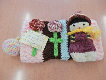 私も紹介用に1ついただきました。少しの間お借りして、夏が過ぎた頃にケアとして使わせていただきたいと思います。こちらのマフ、右のお人形のところは94才の方が作られたそうです。この人形に合わせてそれ以外の部分を作成しています。あまりのクオリティの高さに驚いてしまいます。