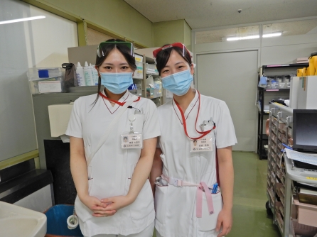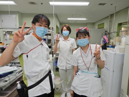 職場ラウンドで新人看護師達の様子を写真に撮らせてもらいました。業務に向かう真剣?必死?な表情もカメラを向けると笑顔になります。頑張っていますね。