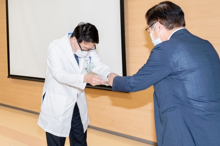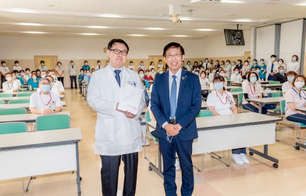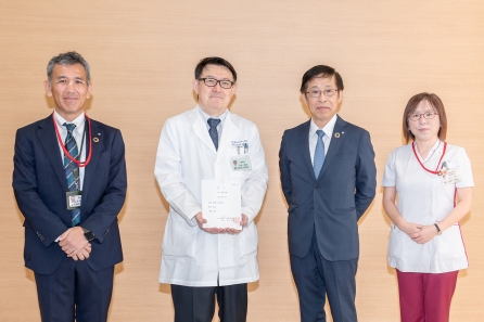 今月は病院長交代があったため、青木理事長から山本院長へ辞令が交付されました。