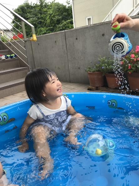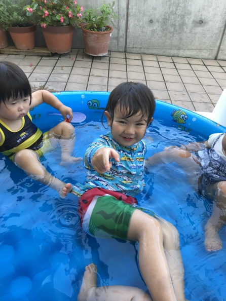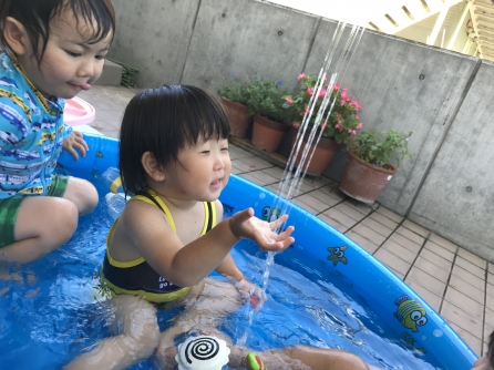 さくら保育園の園児たちは暑さに負けず、毎日温水のプールで楽しく遊んでいます。