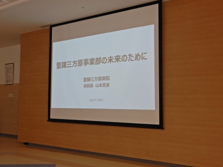 いわゆる所信表明演説です。聖隷のはじまり、理念、大切にしなくてはならないもの、分かりやすく話してくれました。質管理についても言及、それぞれが自分が何をすべきか考えながら聞いたことと思います。