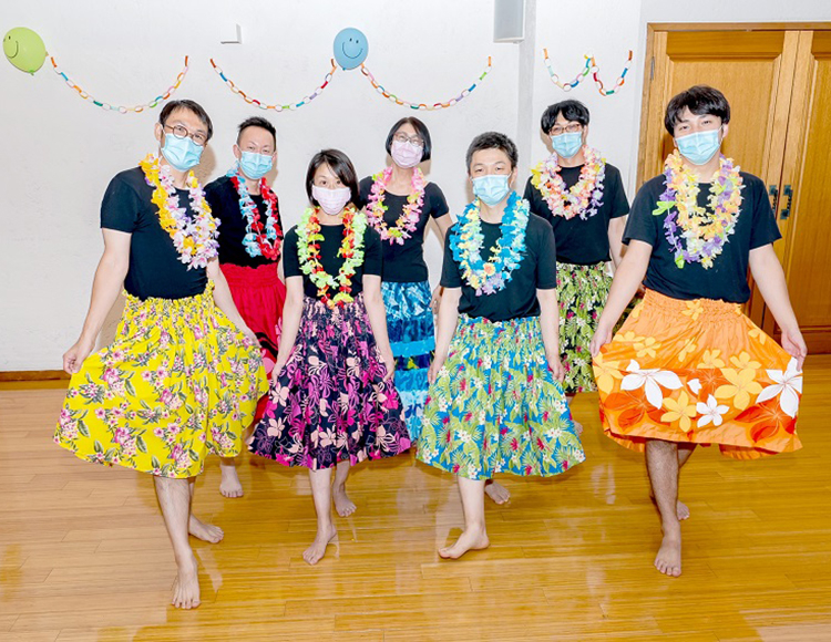 こんにちは! ここ数年コロナ禍でホスピス科の「納涼祭」も行われませんでしたが、 今回久しぶりの「納涼祭」の様子をお伝えします♪ 丁度、8月のホスピス科には2年目S先生がローテート中☆ ホスピス科の先生の出し物のお手伝いをするS先生の様子もバッチリ見られそうですっ。 会場となるホスピス科内にある談話室や礼拝堂にはお祭りの雰囲気を出すために スタッフの方々が様々な飾り付けをしてくださっていました。さぁ、お次は先生方のフラダンスタイムです。 7名のダンサーが礼拝堂に入場するやいなやパァ~と明るい雰囲気に包まれました♪ 皆違う色の「パウスカート」を身に纏いスタンバイ☆ 曲が流